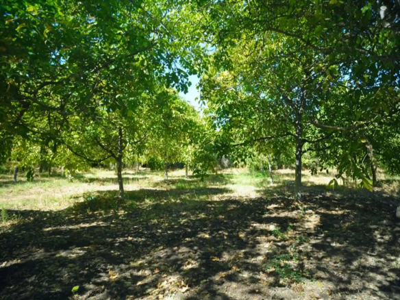 La parcela incluye una variedad de árboles frutales en plena producción, como almendros, duraznos, damascos, pomelos, naranjos, manzanos y granadas, además de una plantación de nogales también en etapa productiva.